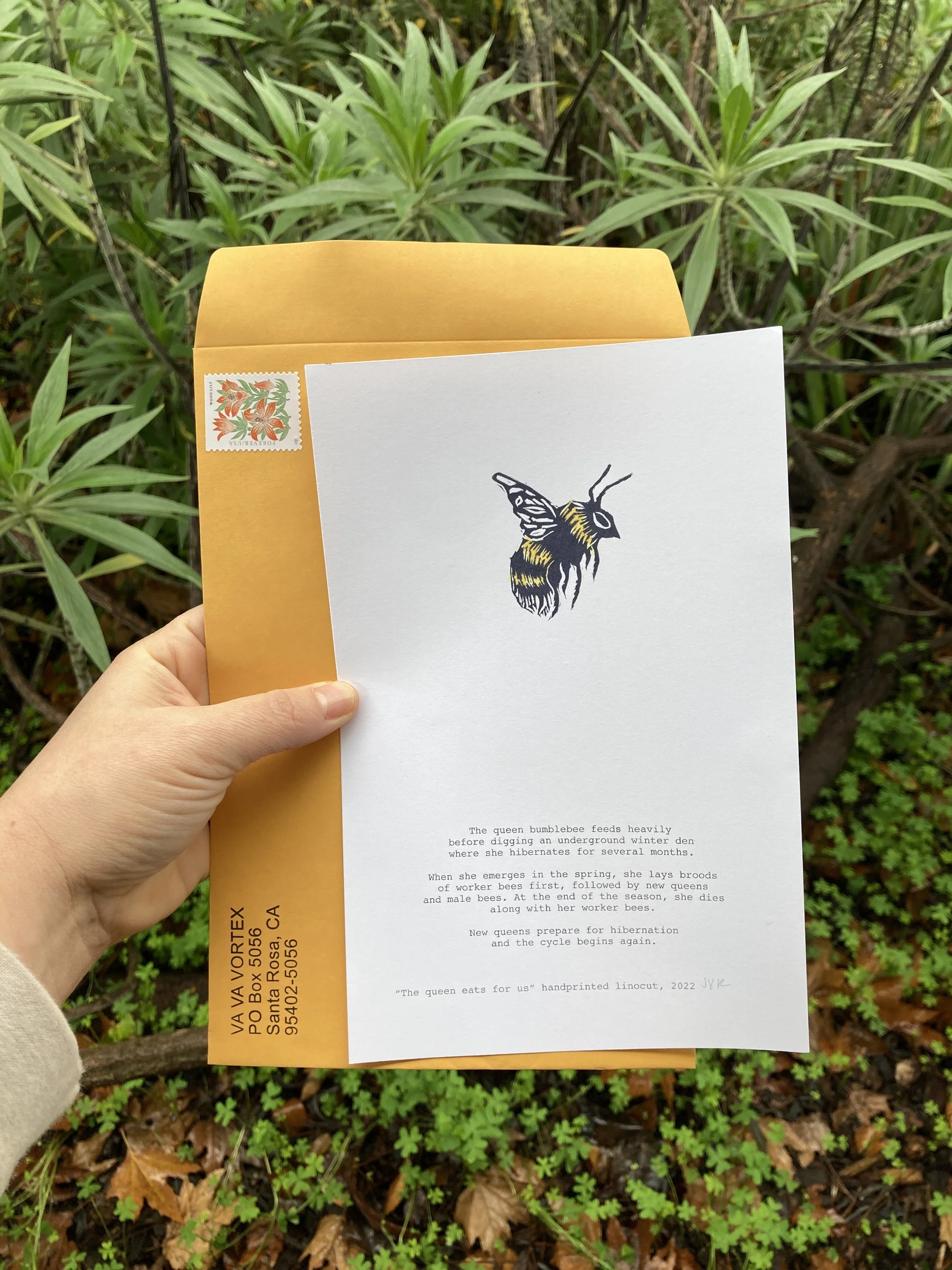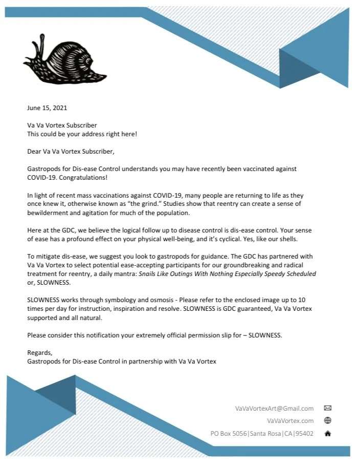 June’s Va Va Vortex installment was a highly official permission slip for SLOWNESS - A Snail block print, to be referenced up to 10x per day, as a reminder and inspiration for SLOWNESS. Certified accompanying letter HERE.