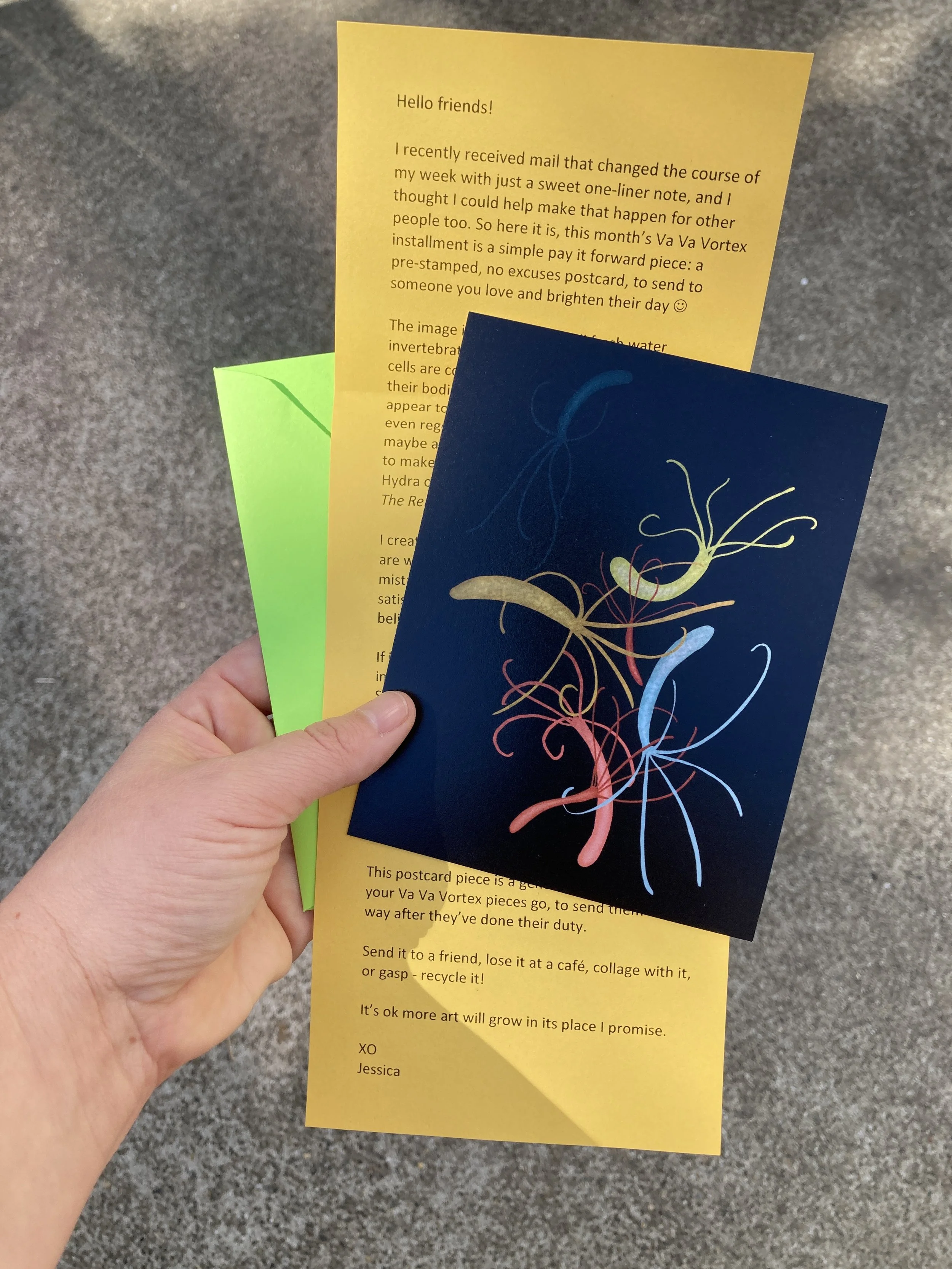 This postcard piece is a gentle nudge. It’s ok to let your Va Va Vortex pieces go, to send them on their way after they’ve done their duty. Send it to a friend, lose it at a café, collage with it, or gasp - recycle it!