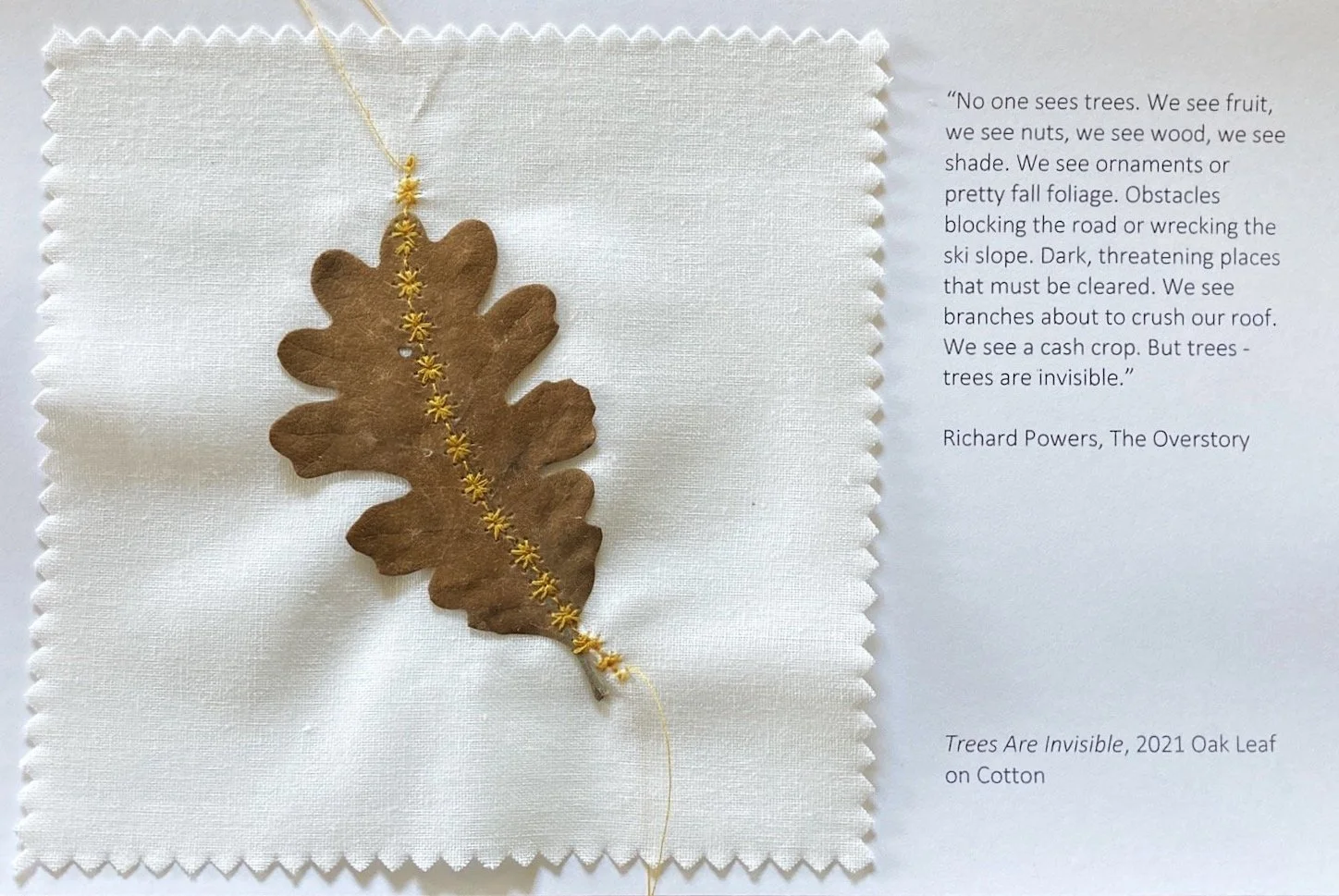 This piece is a brutish interpretation of the detailed and delicate work by Susanna Bauer. She says, “Looking closely at a leaf, its uniqueness becomes apparent. Varied in tone, size and shape, no two leaves, even coming from the same tree, are ever the same, each carrying its own individual network of veins like a fingerprint. By combining crochet with such a seemingly fragile material as a leaf, I’m seeking to explore themes including the value of time and preciousness of objects, tenderness and tension in human connections, and vulnerability and resilience, found in nature as a whole as well as in the stories of individual beings.”
