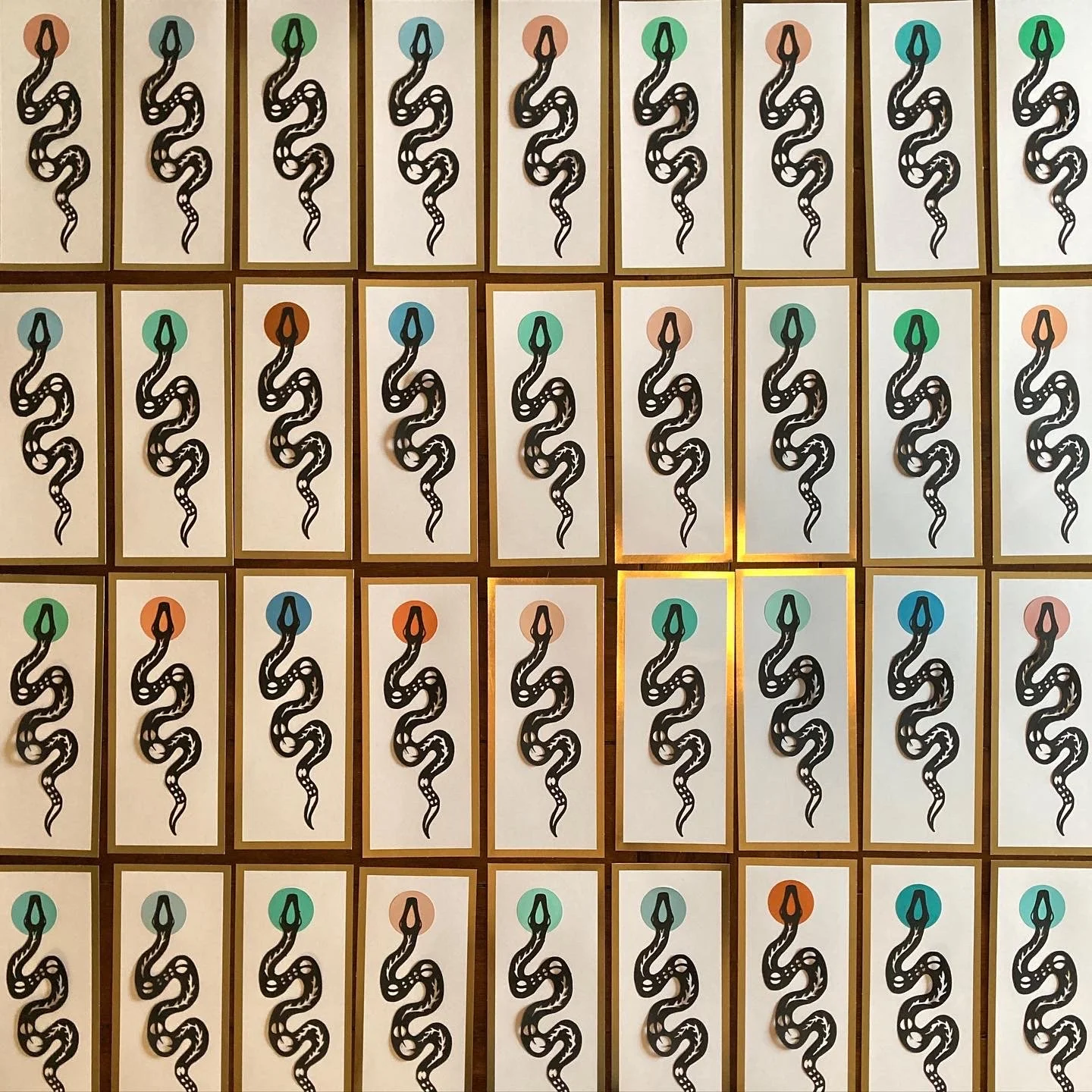 The circular cutouts are cut from upcycled paint sample cards. The snake was hand drawn then sent through my electronic cutting machine!