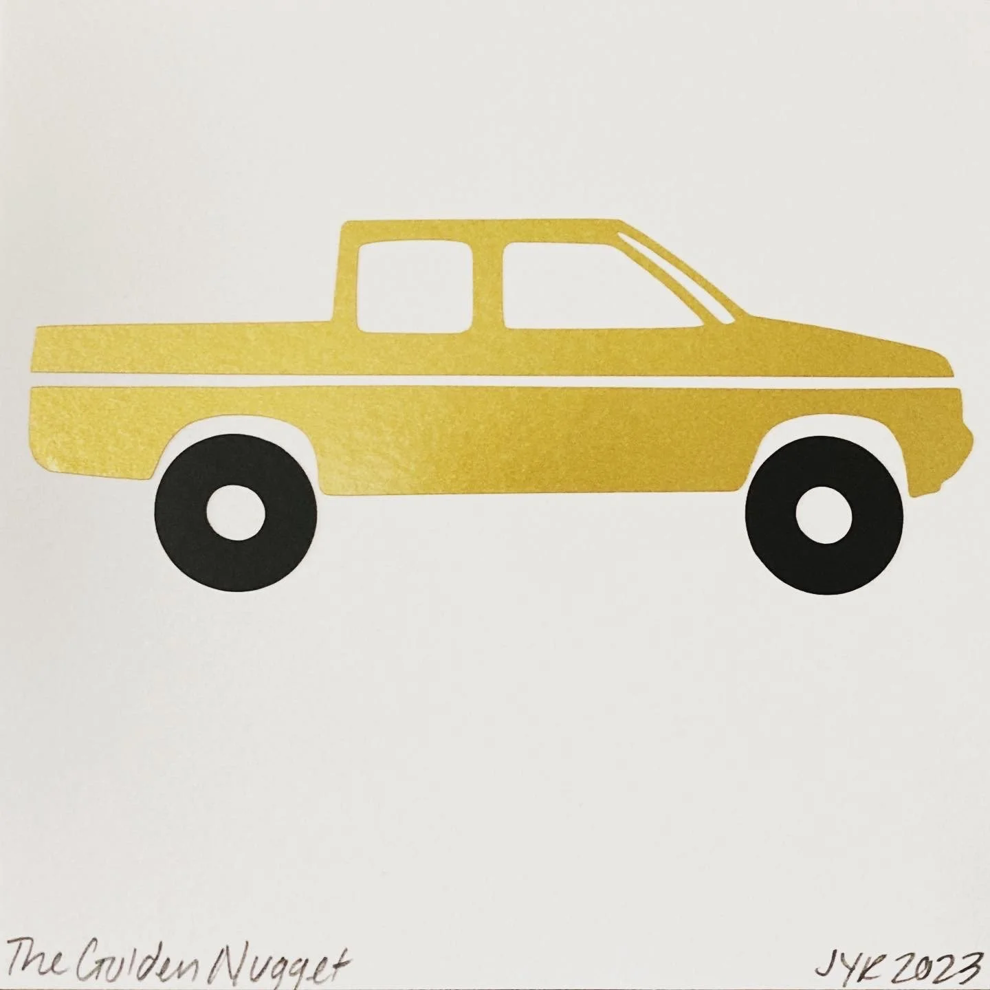 I drew the image in pro-create to get a true likeness, then sent the image through my vinyl cutter creating a sticker in four parts. I bought gold vinyl for the perfect color of my truck, and used various scrap blacks for the tires. After cutting Bristol paper into squares, I stuck the stickers on for a sweet little piece!
